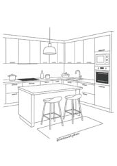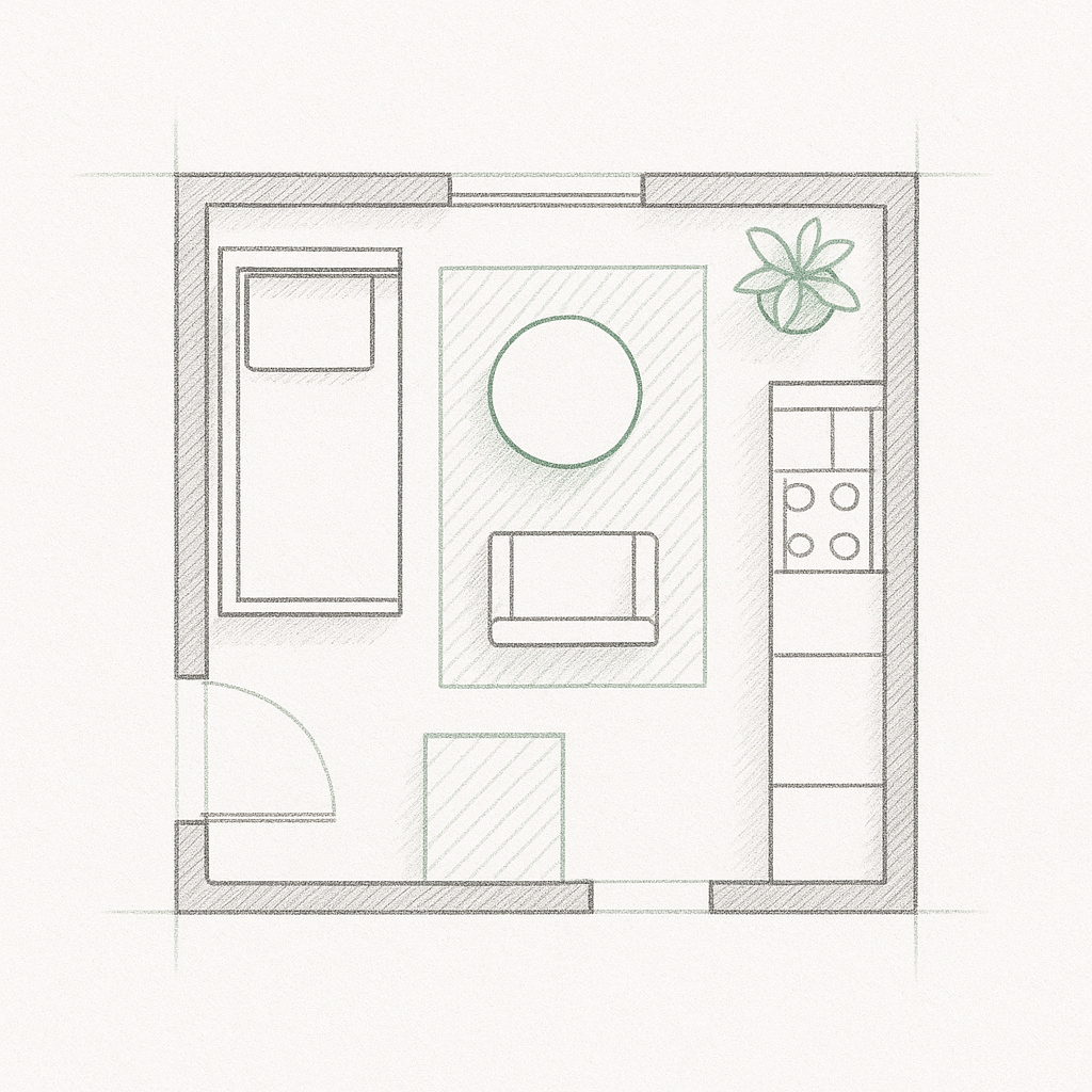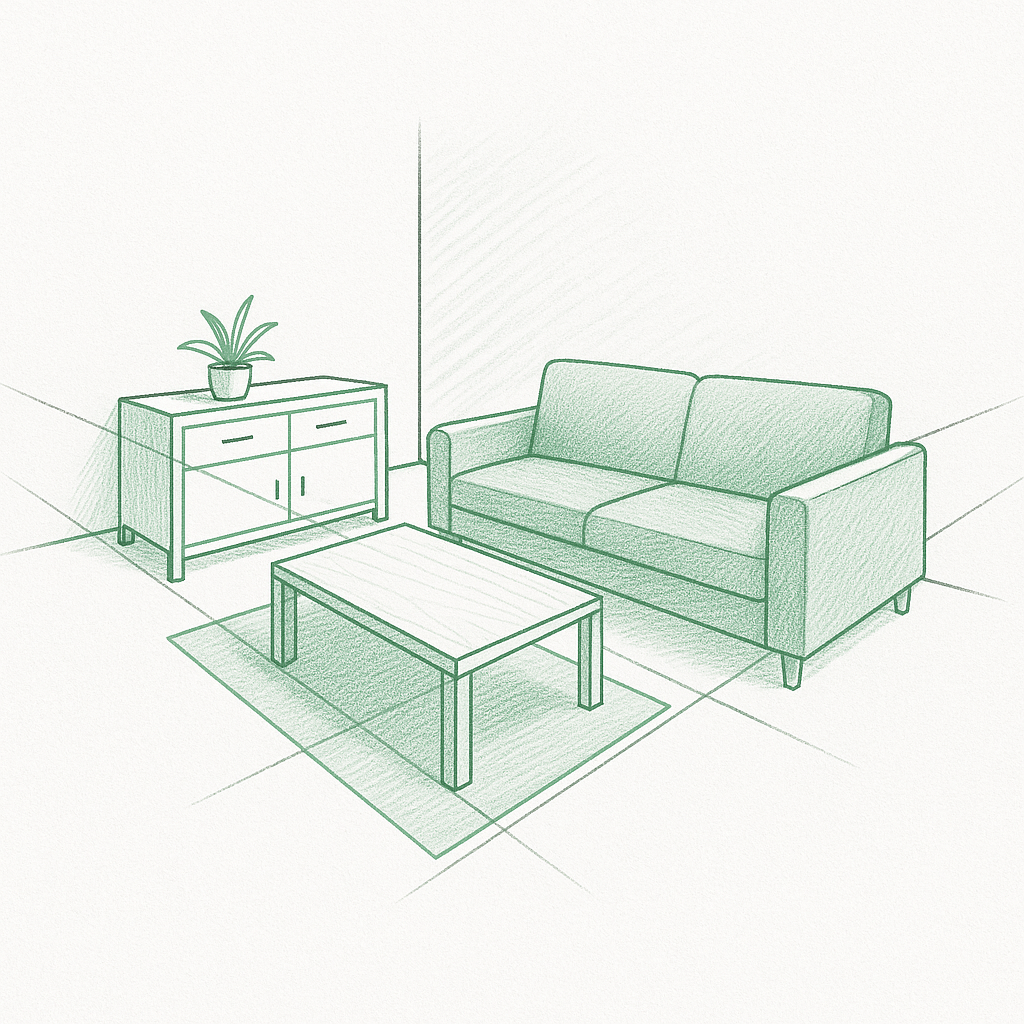 Přidej doplňky – koberec, lustr, květiny, případně stínování pro lepší čitelnost. Můžeš také vyznačit směry pohybu nebo světla. Celý výkres by měl být čistý, přehledný, názorný a vzdušný.