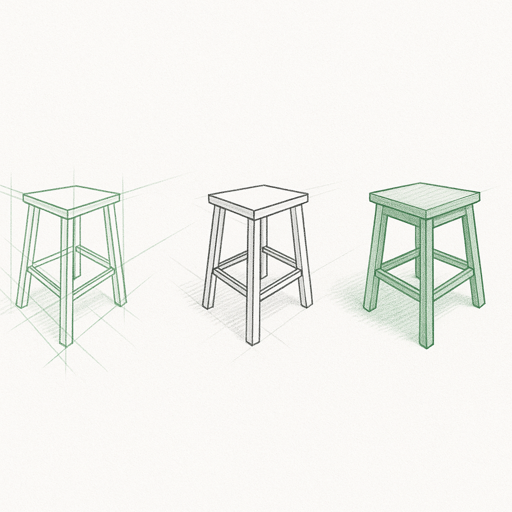 Vytvoř si svou perspektivu a pomož si kvádrem definovat stoličku v prostoru. Začni jemnou linkou. Najdi správný tvar. Pomocné linky pak vygumuj (měj v jiné vrstvě).