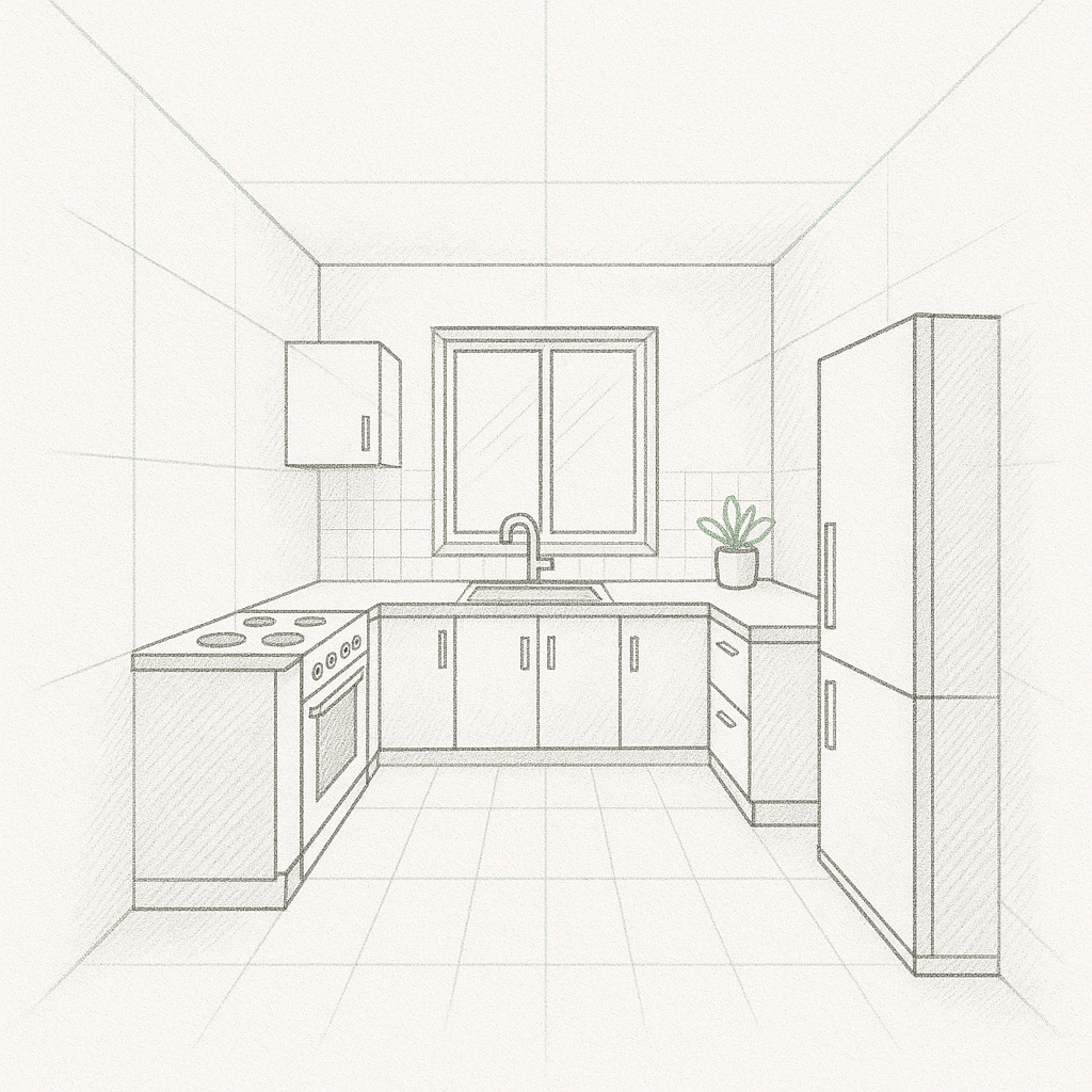 Začni obdélníkem nebo čtvercem jako hranicí místnosti. Přidej tloušťku stěn, vyznač dveře a okna. Dbej na přehledné proporce a měřítko. Pracuj jemně, pomocné linky si nech zvlášť.